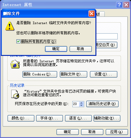 第二步,点击“删除文件”按钮,在弹出的窗口中选中“删除所有的脱机内容”,如下图。