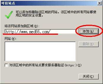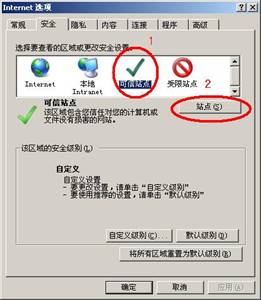 3.打开“Internet 选项”对话框,点击“安全”选项卡。选择“可信站点”按钮。点击“站点”按钮(图1),在“可信站点”中输入相关网站地址,然后点击“添加”。