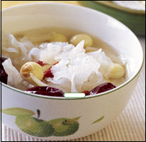 制法:将黑木耳、红枣(去核)浸开、洗净,文火炖开后调入瘦肉。煲至肉熟,服食。