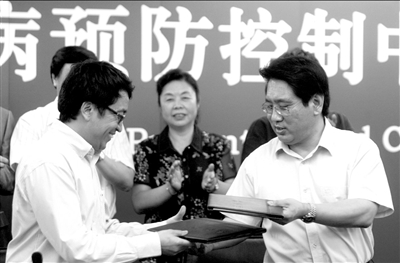 北京市疾控中心主任邓瑛(右)与科兴公司签订首批500万人份甲流疫苗
